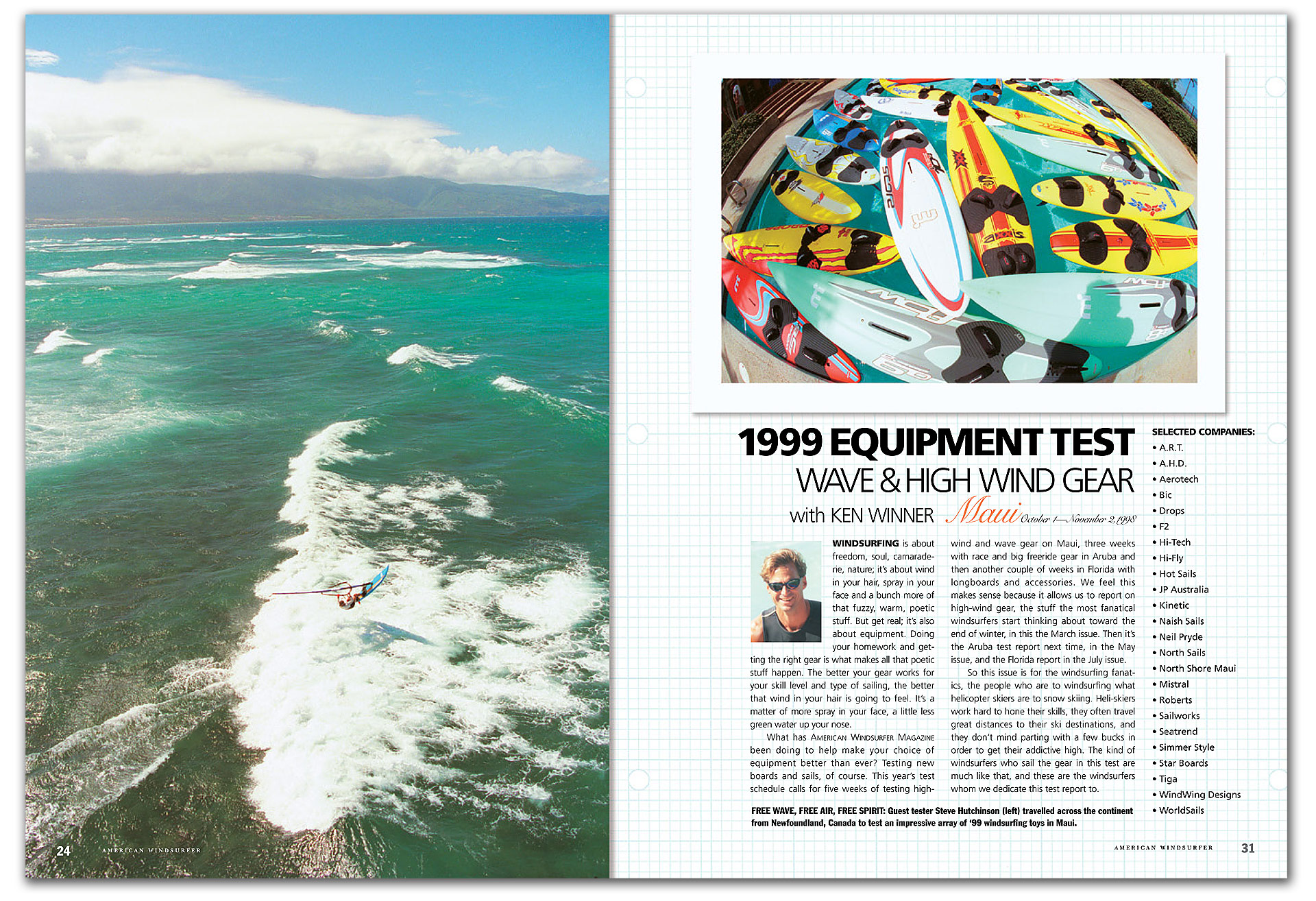 Maui, three weeks with race and big freeride gear in Aruba and then another couple of weeks in Florida with longboards and accessories. We feel this makes sense because it allows us to report on high-wind gear, the stuff the most fanatical windsurfers start thinking about toward the end of winter, in this the March issue. Then it’s the Aruba test report next time, in the May issue, and the Florida report in the July issue.