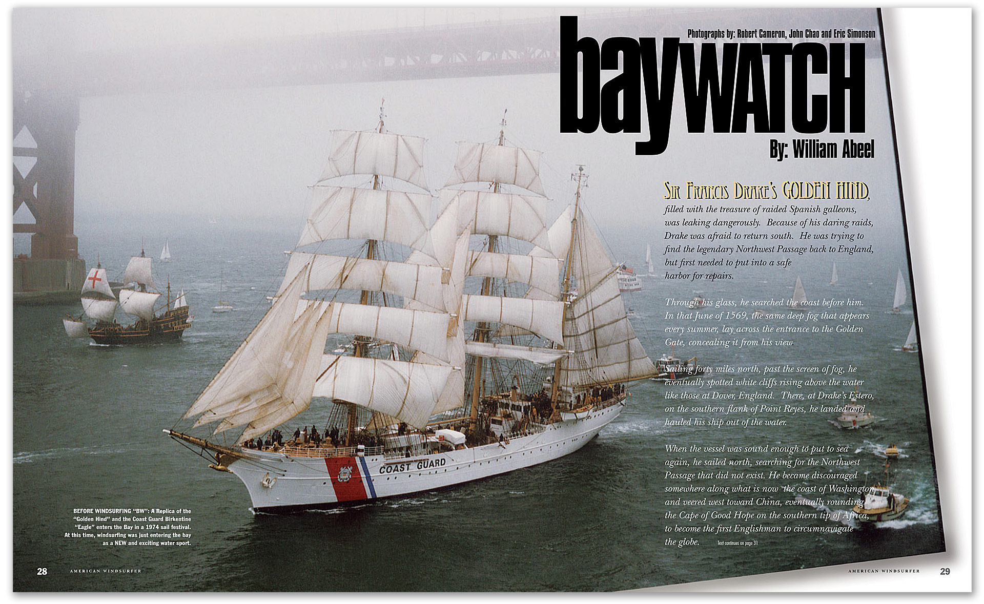Then I gaze far across at the other side and consider the 350 feet of cold water straight down under the Bridge. When I finally stand, knee-deep in my wetsuit, hands gripping the boom, back foot tensed for the right wave, I feel like Sir Frances Drake setting his sail for an unknown world.NOW WHEN I CROUCH, rigging on the beach that Drake missed, I glance up at the bridge, gauge the wind speed, check the chop and an ebbtide going out toward that same China, faster than a man can walk.  Each time, I’m struck with wonder.  I marvel at its beauty and my good fortune to be there. I reflect on the sanctity of abundant water and, like those first Arab princes, of people who will never see a sight like this. I think of “the Great Drought” of 1933 that started a veritable migration to this coast.  I see in my mind, the scorched plains, and remember the dust storms that turn air black for a hundred miles. I also picture in my mind the stretched–out dead cattle and, looking out before me, remind myself that all life came originally from the sea.