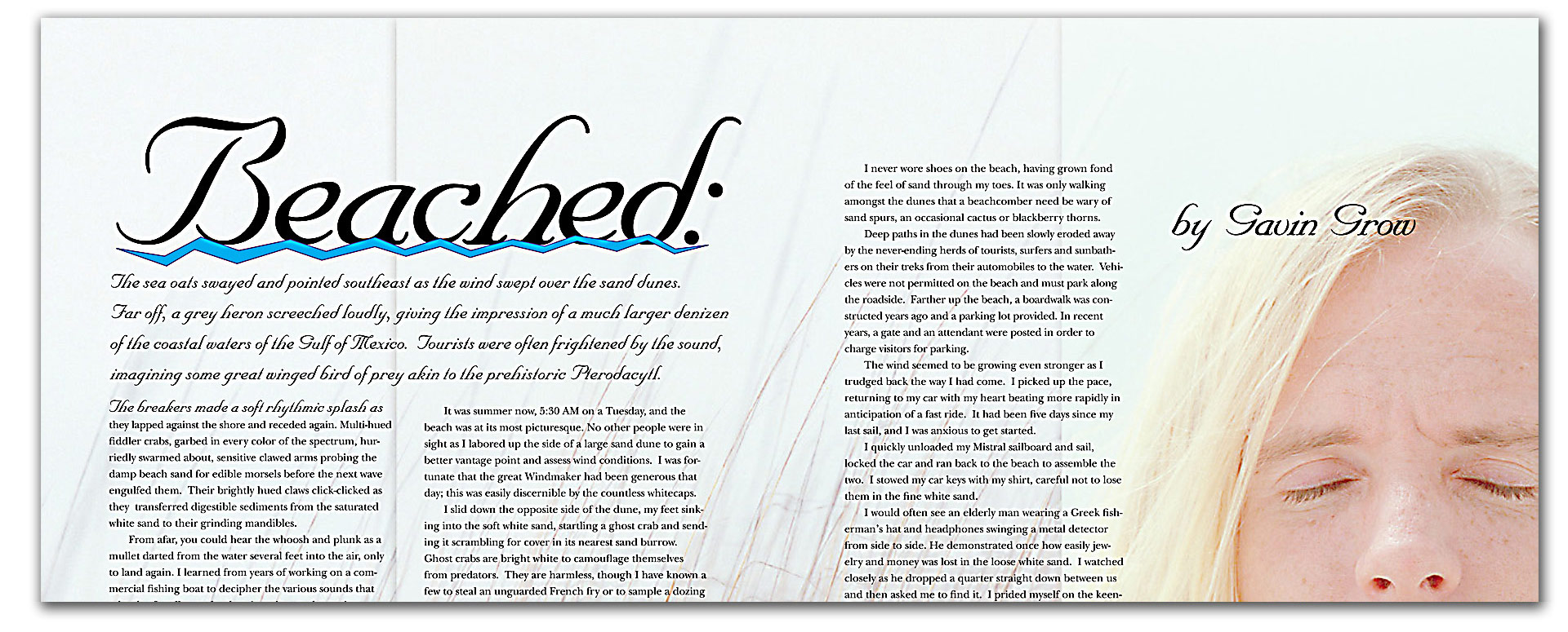 Tan muscular deltoids and biceps, developed from years of pulling 2800 feet of gill net onto a commercial fishing boat, bulged with the effort to ride the wind. My board first pounded, then glided over the chop, rapidly increasing knots. Frightened schools of pompano darted out of my path as I raced overhead. I tacked around a channel marker and began to race parallel to the beach at an awesome speed.