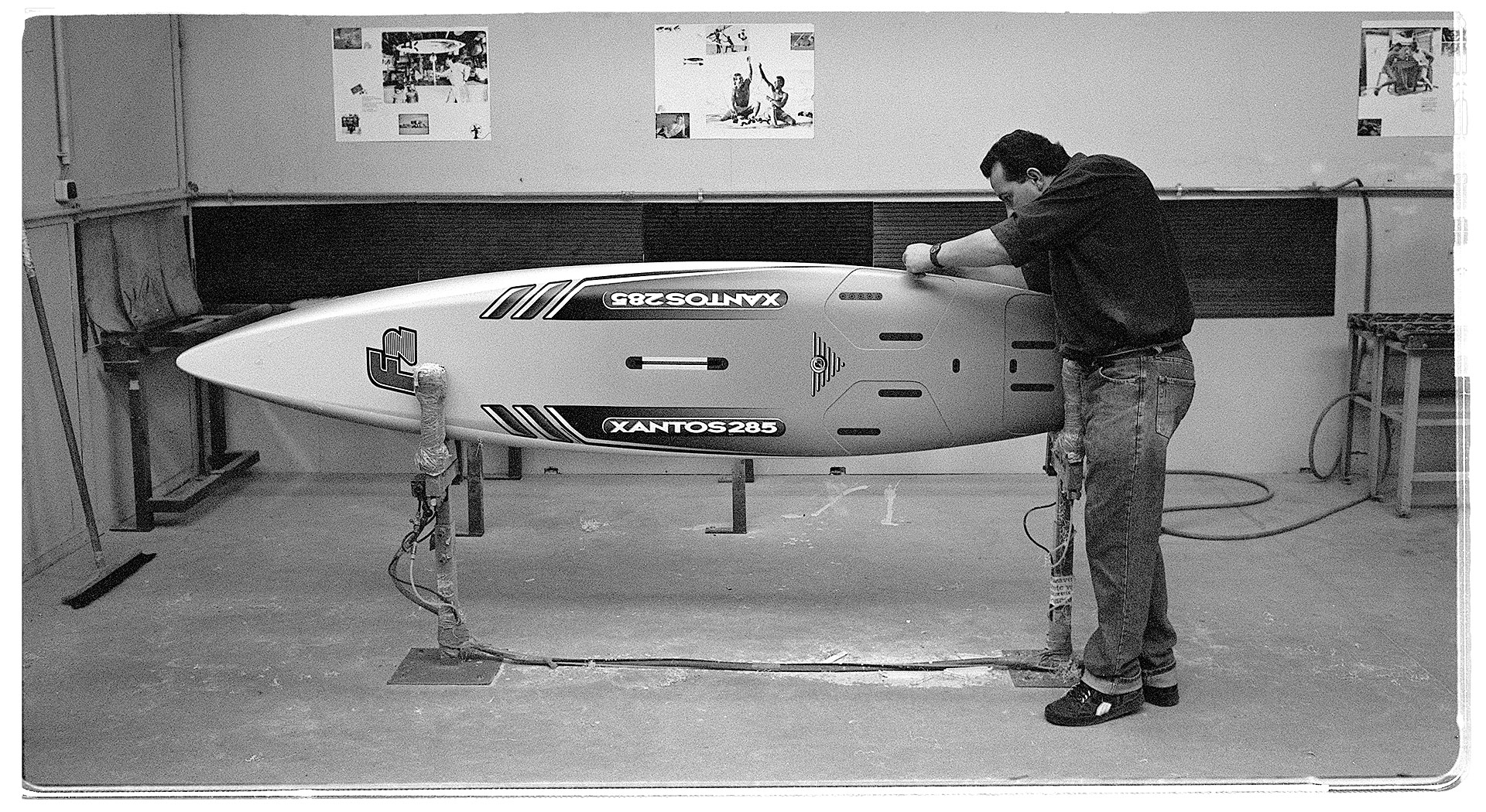 THE THRILL YOU GET from a board beneath you on a twenty-five knot day is made possible by factories like the F2 Kirchdorf plant in Austria. The F2 plant is similar to other assembly plants such as Bic and Mistraland the production process is hard to beat. Strong and light, these boards triumph in the face of the challenging task to keep pace with the technical evolution of the sport.