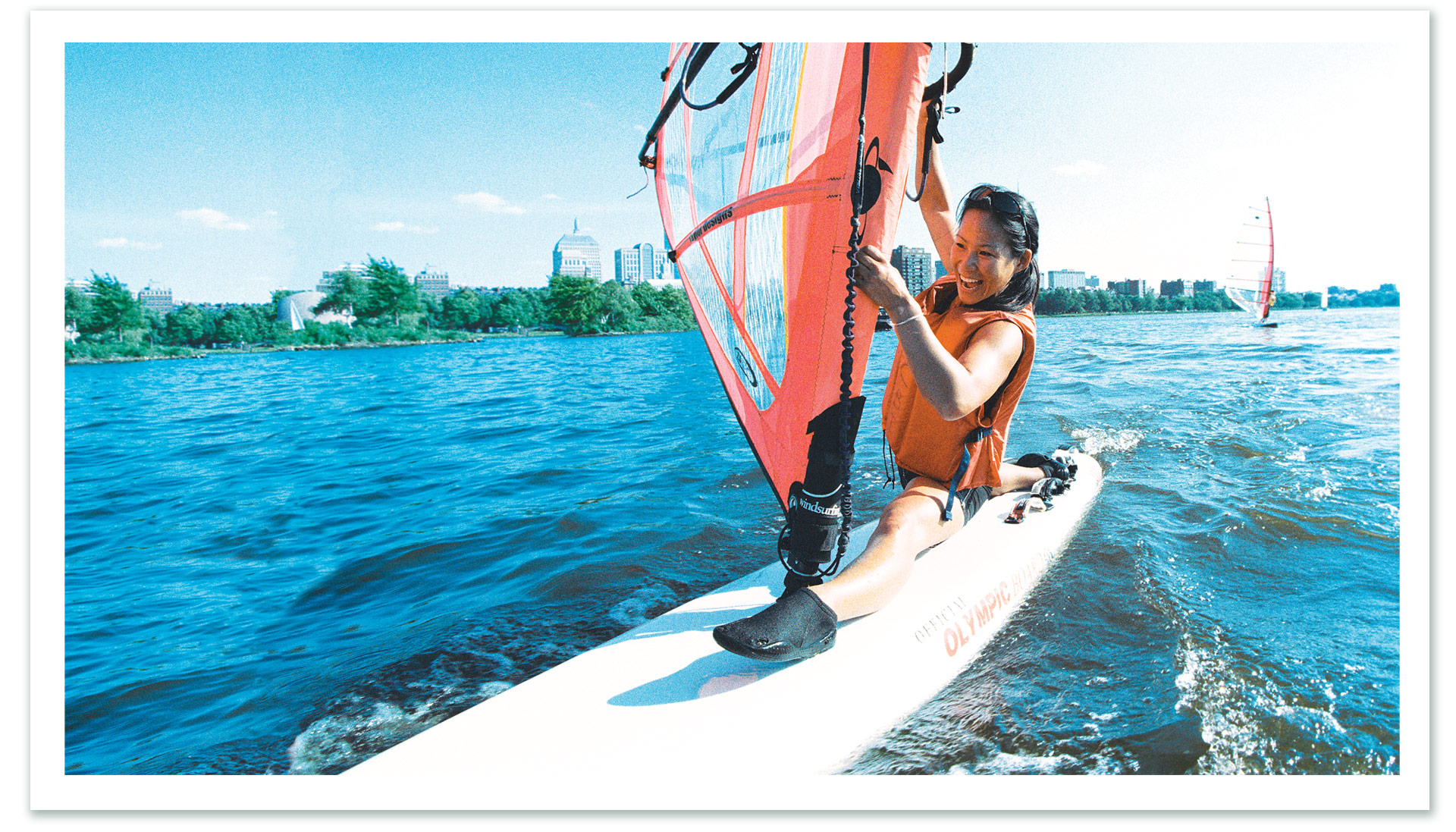 OVERACHIEVER Nancy Liu practice freestyle on the Charles River in the heart of Boston. The well travelled medical student is one of six windsurf instructors at the Community Boating Center. “It wasn’t easy.” Said the 30 year-old adventurer about her decision to leave her life of adventure and return to the US for med school. “If one believes, however, that things happen for reason, well, that reason for me has been windsurfing.Who would have thought that it would be Boston where I discovered this sport!”