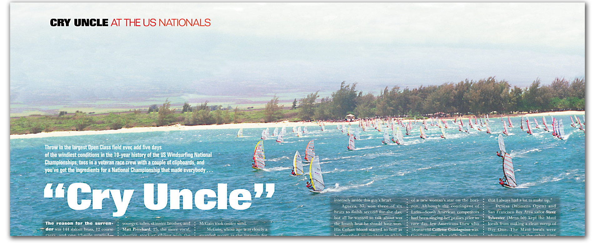 Throw in the largest Open Class field ever, add five days of the windiest conditions in the 10-year history of the US Windsurfing National Championships, toss in a veteran race crew with a couple of clipboards, and you’ve got the ingredients for a National Championship that made everybody . . . Cry Uncle!
