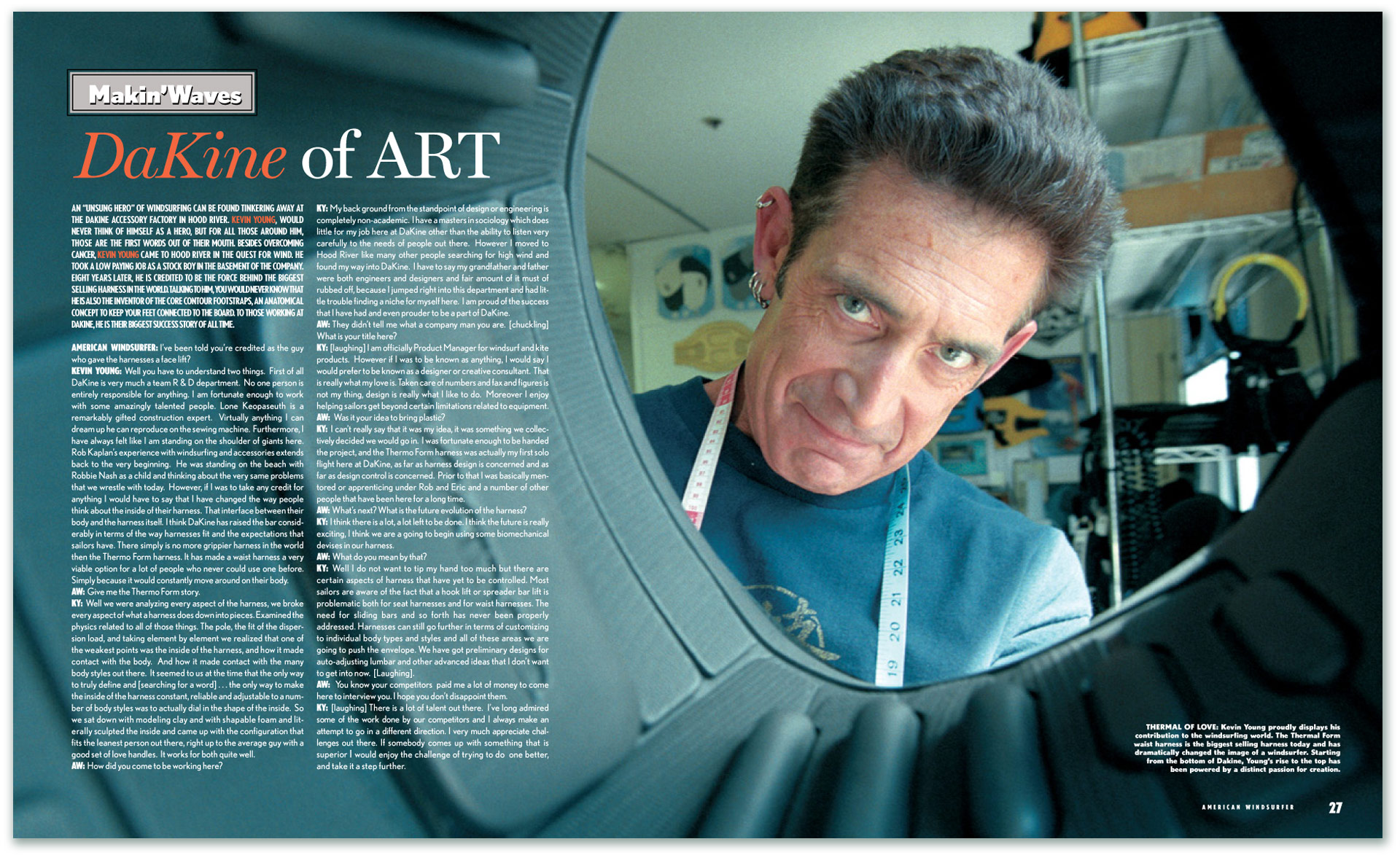 AN “UNSUNG HERO” OF WINDSURFING can be found tinkering away at the Dakine factory in Hood River. KEVIN YOUNG would never think himself to be a hero, but for all those around him, a hero is the exact first word out of their mouths. Besides overcoming cancer, Kevin came to Hood River in the quest for wind. He took a low-paying job as a stock boy in the basement. Eight years later, he is credited to be the force behind the biggest selling harness in the world. Talking to him, you would never know that he is also the inventor of the Core Contour Footstraps, an anatomical concept to keep your feet connected to the board. TO those working at Dakine, Kevin Young is their biggest success story of all time.