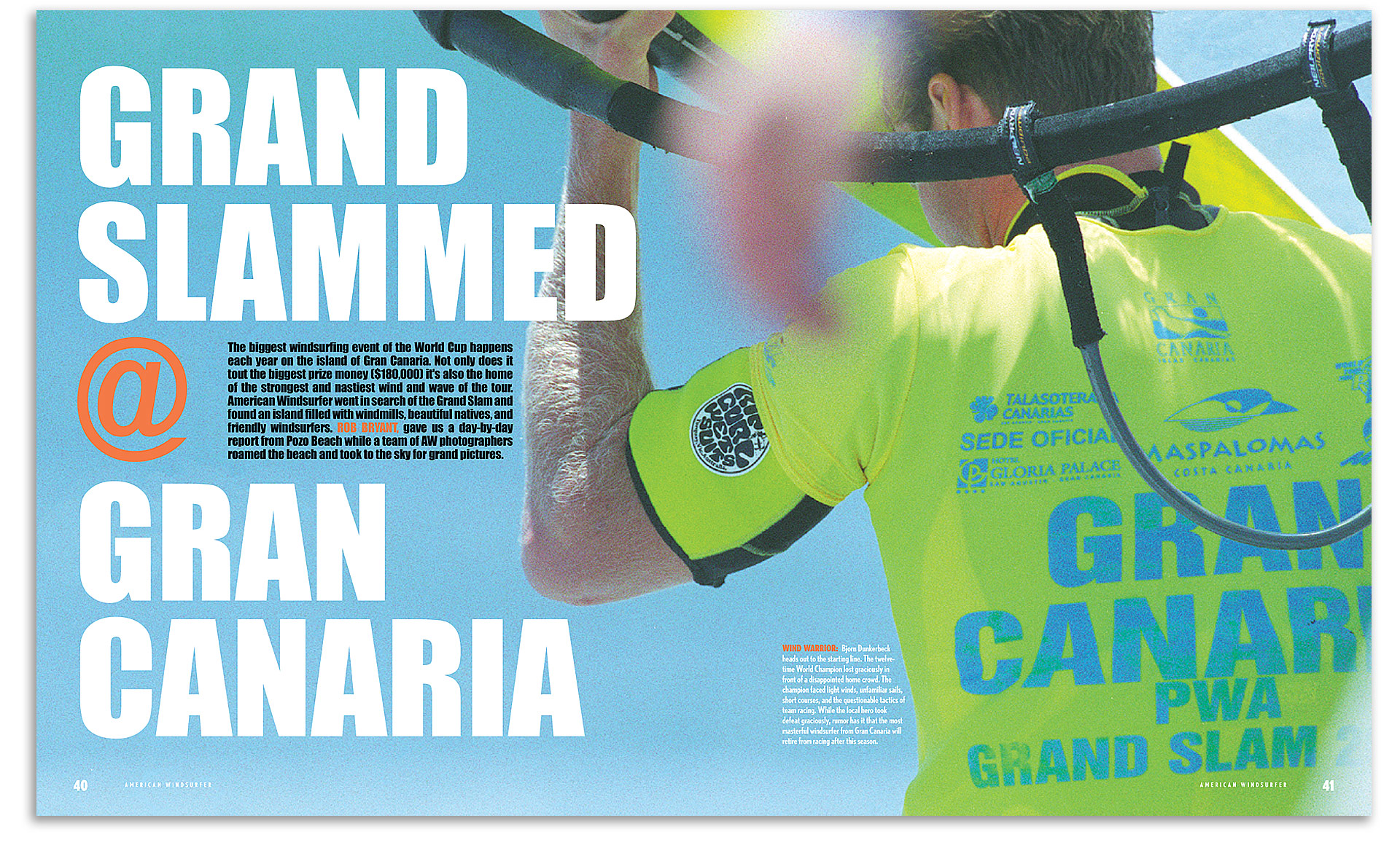 The biggest windsurfing event of the World Cup happens each year on the island of Gran Canaria. Not only does it tout the biggest prize money ($180,000) it’s also the home of the strongest and nastiest wind and wave of the tour. American Windsurfer went in search of the Grand Slam and found an island filled with windmills, beautiful natives, and friendly windsurfers. Rob Bryant, gave us a day-by-day report from Pozo Beach while a team of AW photographers roamed the beach and took to the sky for grand pictures.