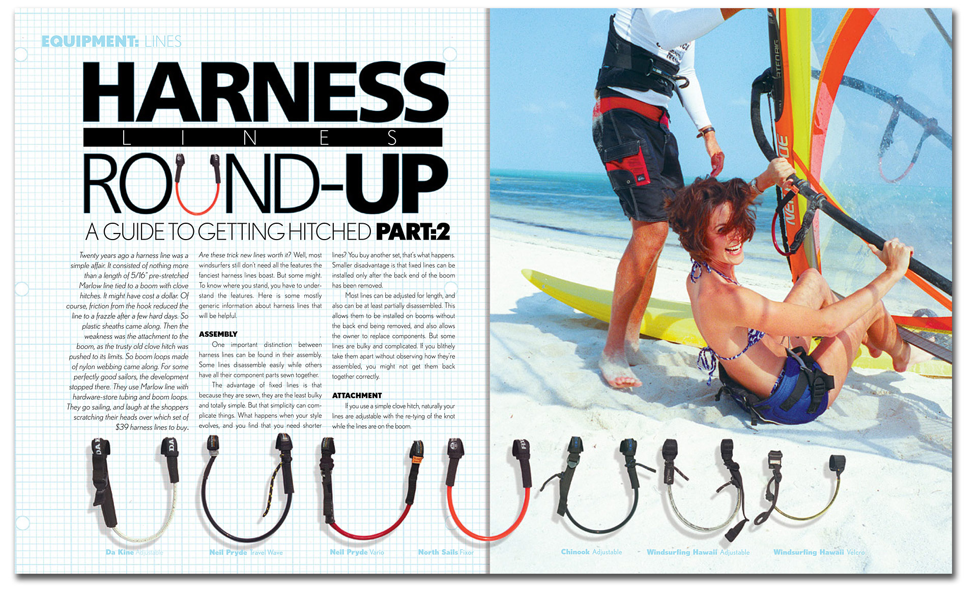 Twenty years ago a harness line was a simple affair. It consisted of nothing more than a length of 5/16” pre-stretched Marlow line tied to a boom with clove hitches. It might have cost a dollar. Of course, friction from the hook reduced the line to a frazzle after a few hard days. So plastic sheaths came along. Then the weakness was the attachment to the boom, as the trusty old clove hitch was pushed to its limits. So boom loops made of nylon webbing came along. For some perfectly good sailors, the development stopped there. They use Marlow line with hardware-store tubing and boom loops. They go sailing, and laugh at the shoppers scratching their heads over which set of $39 harness lines to buy.