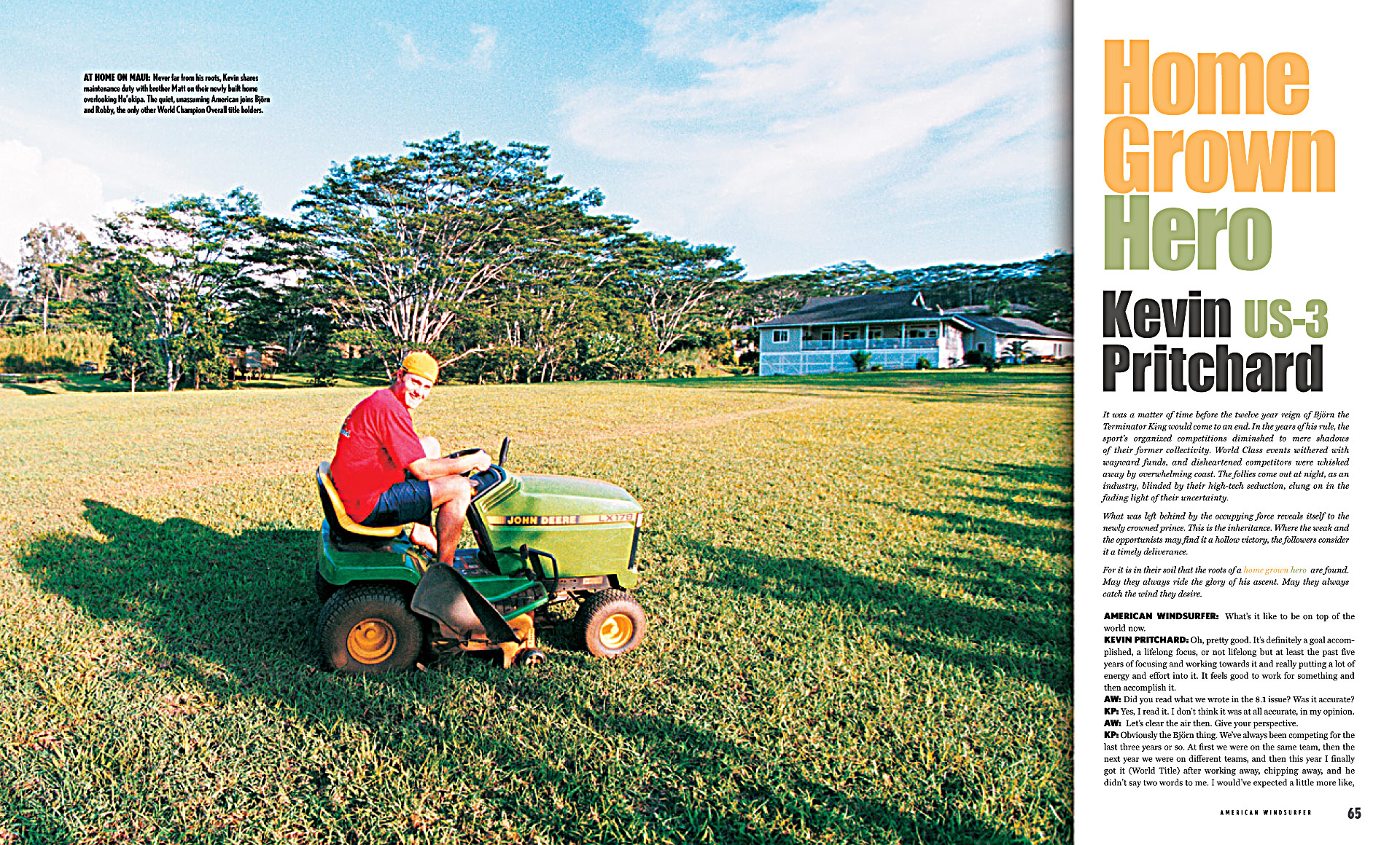 NIPPING AT BJÖRN’S HEELS started in 1999 and soon it became clear that Pritchard had the Right Stuff as he won the Gran Canaria event last July. Looking to the future, Kevin is developing his own line of Formula race boards with Bic. Prototypes were closely guarded in the garage of his Maui home. (left)