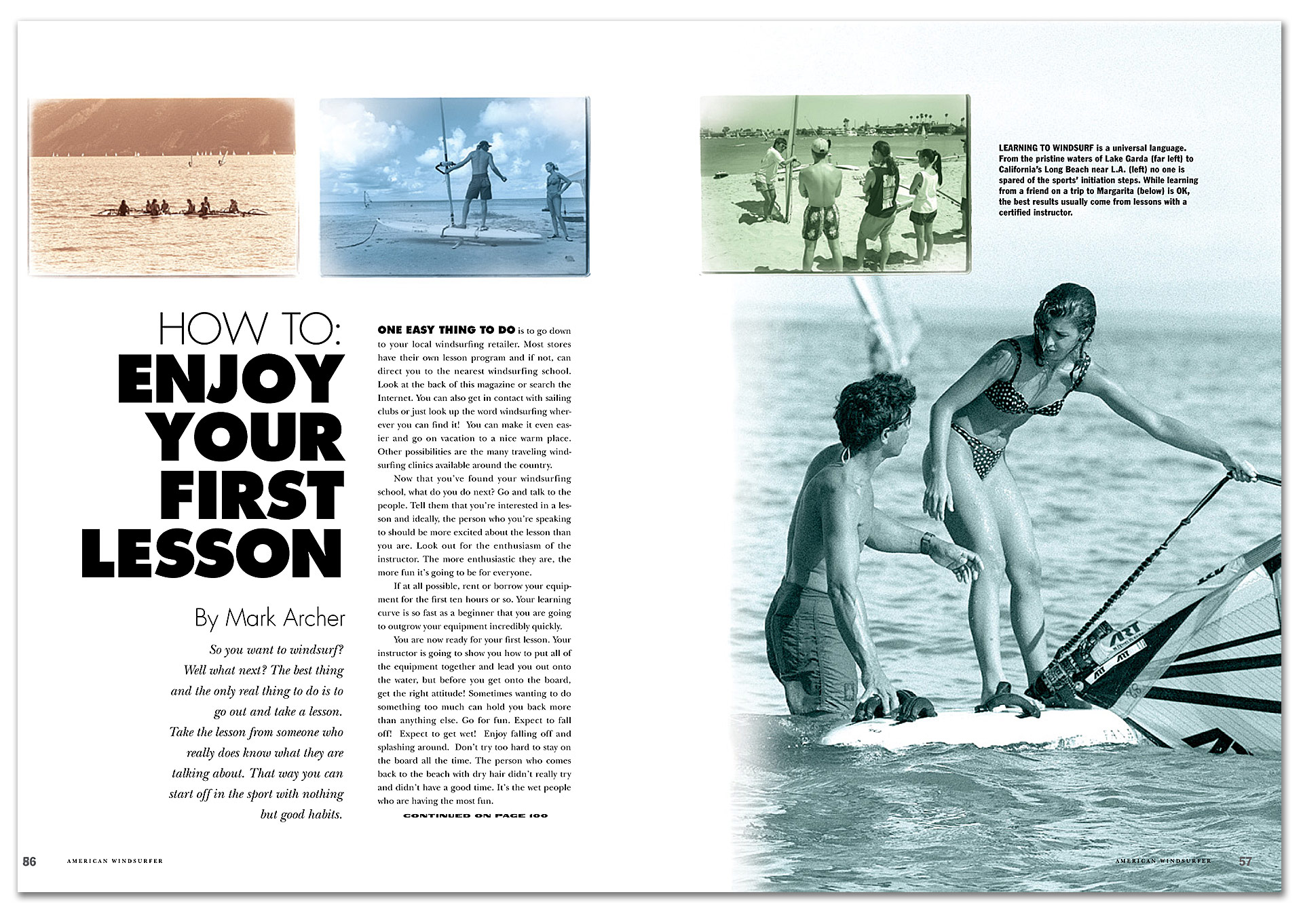 ONE EASY THING TO DO is to go down to your local windsurfing retailer. Most stores have their own lesson program and if not, can direct you to the nearest windsurfing school. Look at the back of this magazine or search the Internet. You can also get in contact with sailing clubs or just look up the word windsurfing wherever you can find it! You can make it even easier and go on vacation to a nice warm place. Other possibilities are the many traveling windsurfing clinics available around the country.