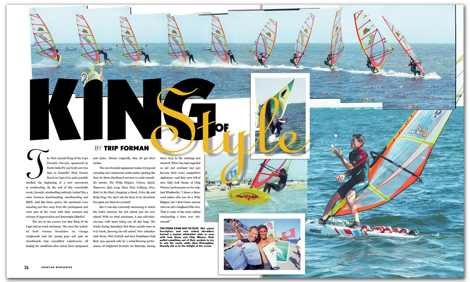 The First Annual King of the Cape Freestyle Pro-Am, sponsored by North Sails/F2 and held over two days at beautiful West Dennis Beach on Cape Cod, quite possibly marked the beginning of a new movement in windsurfing. By the end of this remarkable event, freestyle windsurfing suddenly looked like a cross between skateboarding, snowboarding and BMX. And like those sports, the spectators were standing just feet away from the participants and were part of the event with their screams and whoops of appreciation and downright disbelief.
