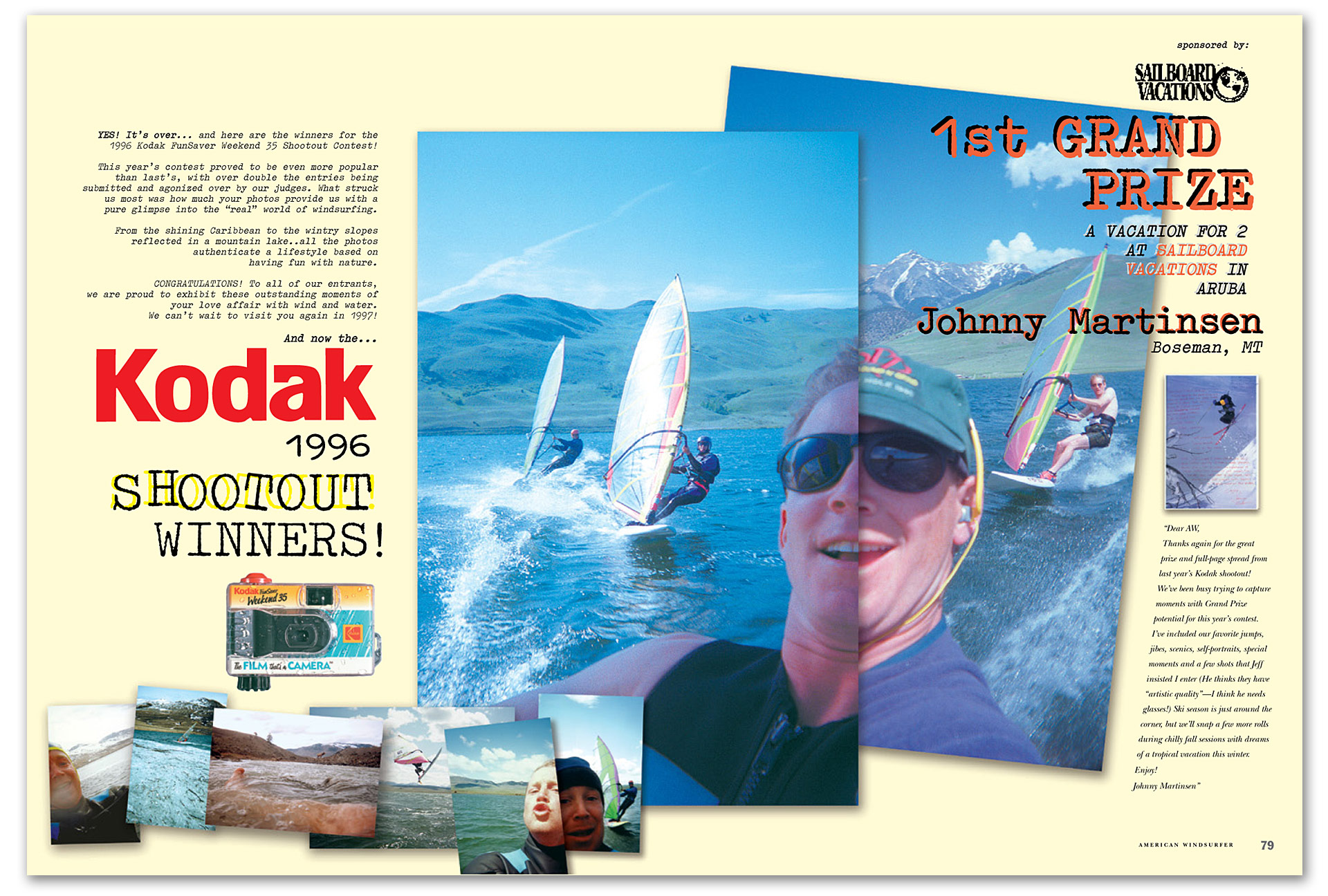 YES!It’s over… and here are the winners for the 1996 Kodak FunSaver Weekend 35 Shootout Contest! This year’s contest proved to be even more popular than last’s, with over double the entries being submitted and agonized over by our judges. What struck us most was how much your photos provide us with a pure glimpse into the “real” world of windsurfing. From the shining Caribbean to the wintry slopes reflected in a mountain lake..all the photos authenticate a lifestyle based on having fun with nature.