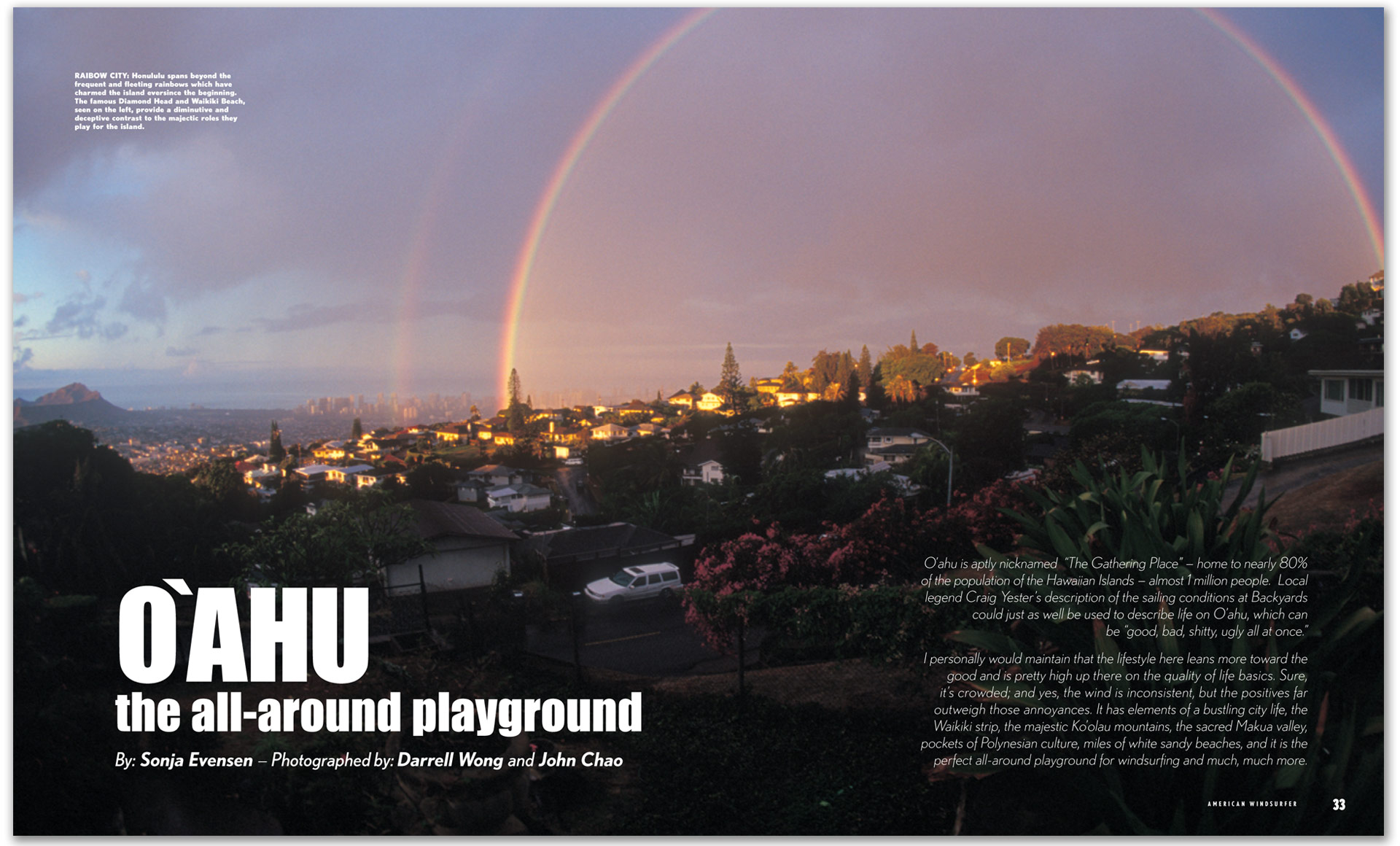 BIRD’S EYE VIEW — from any angle, be it visual, spiritual, or recreational, O’ahu has something for everyone. Culture, career, convienience and kitsch blend together in a natural playground. Beneath the acrobatic glider soaring the trades at the tip of Ka’ena Point, lie the breaks of the legendary North Shore: Pipeline, Sunset Beach, Backdoors, Rocky Point and Waimea Bay. One can’t help but visualize the same majestic views that the Japanese dive bombers saw as they aproached the island 61 years ago.