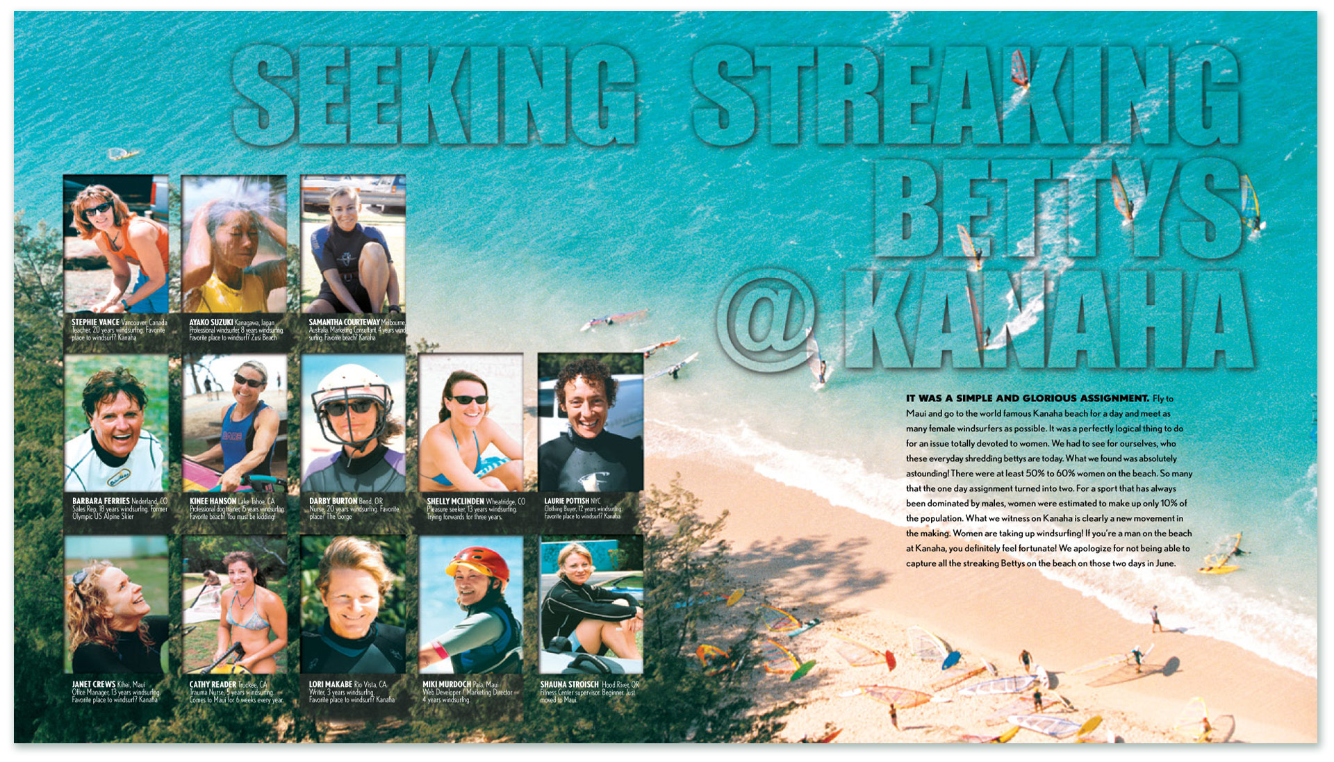 FIRST EVER ALL WOMEN’S ISSUE—was a hit on all levels with the exception of one male aberration who thought the issue was an embarrassment to everyone. Nonetheless the rising voices of the windsurfing sisterhood are a force that we welcome and give hopes to a brighter, more gracious and provocative future. Already, we are reminded of what extraordinary Streaking Bettys that we missed which leads the magazine to only one conclusion: You can bet there will be more “All-Women” issues coming up! .