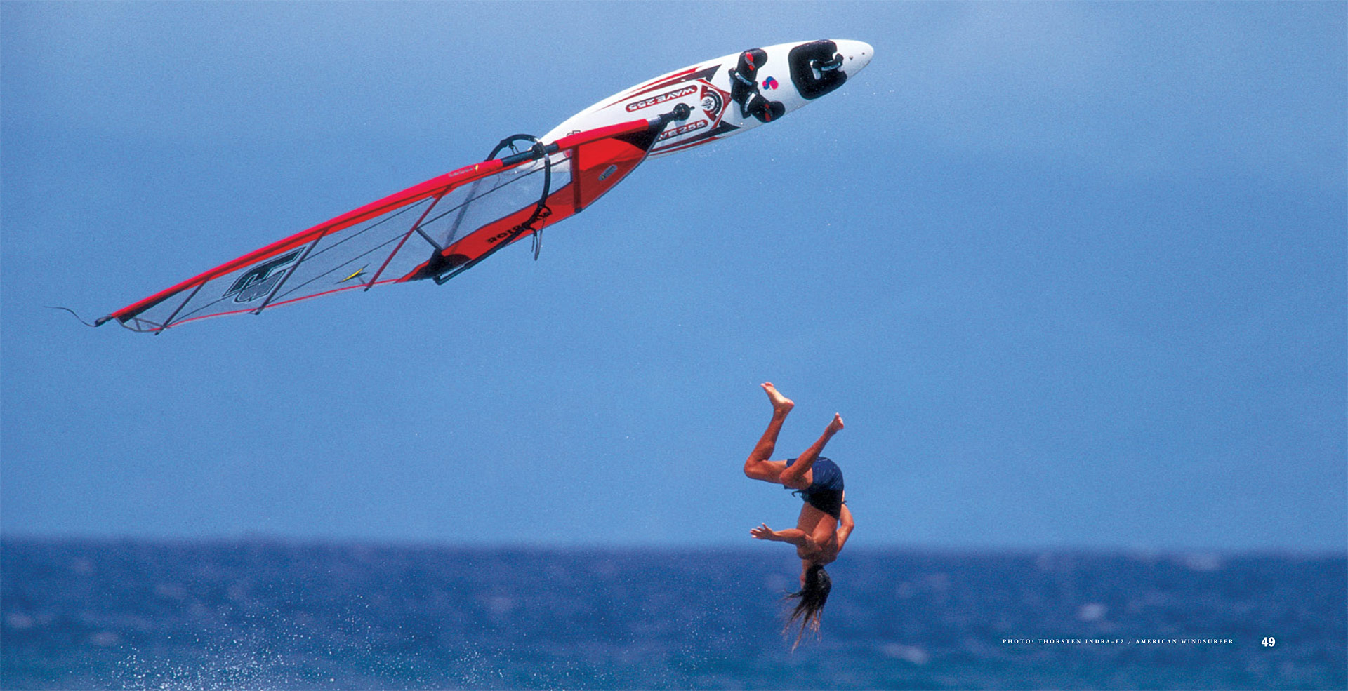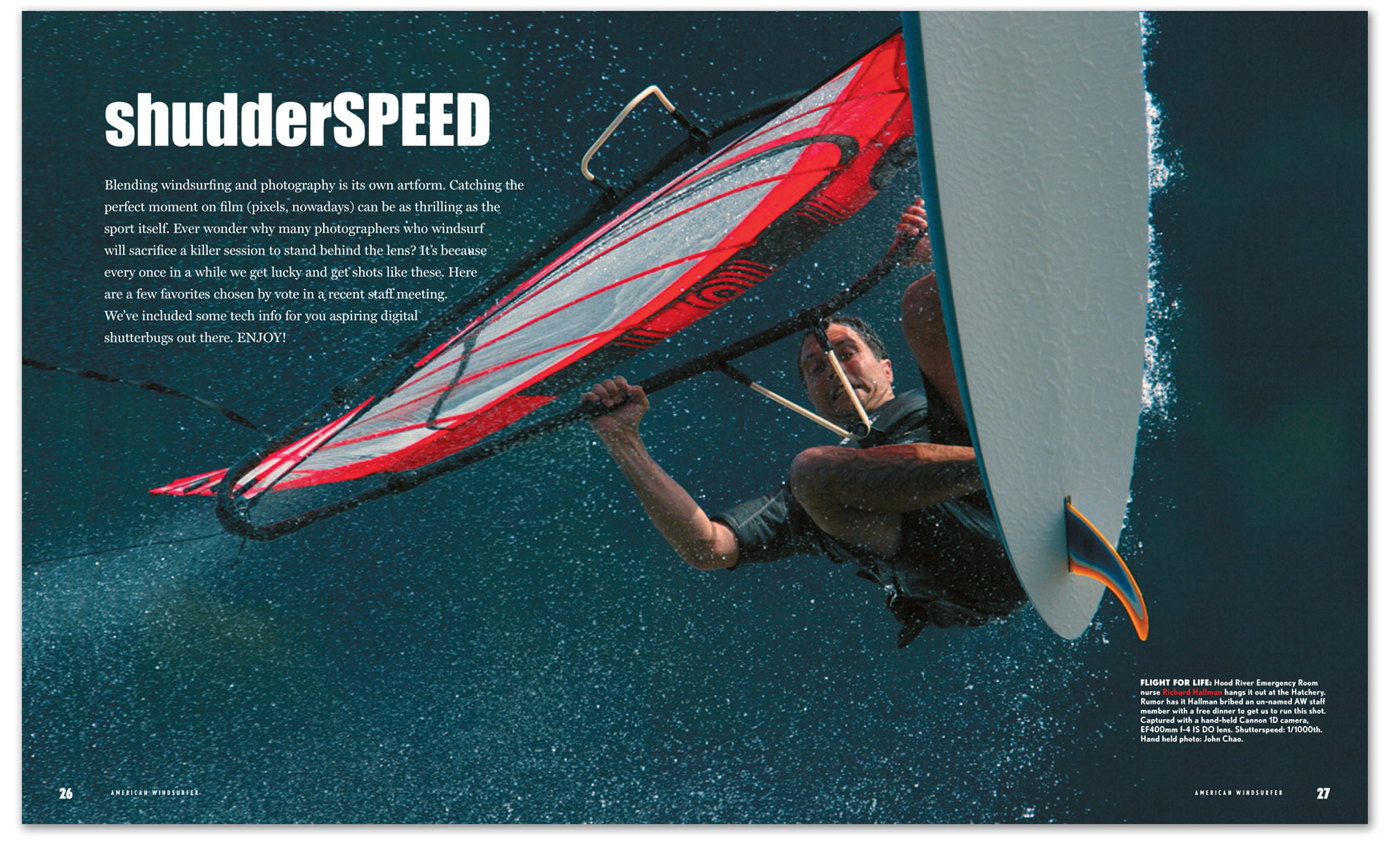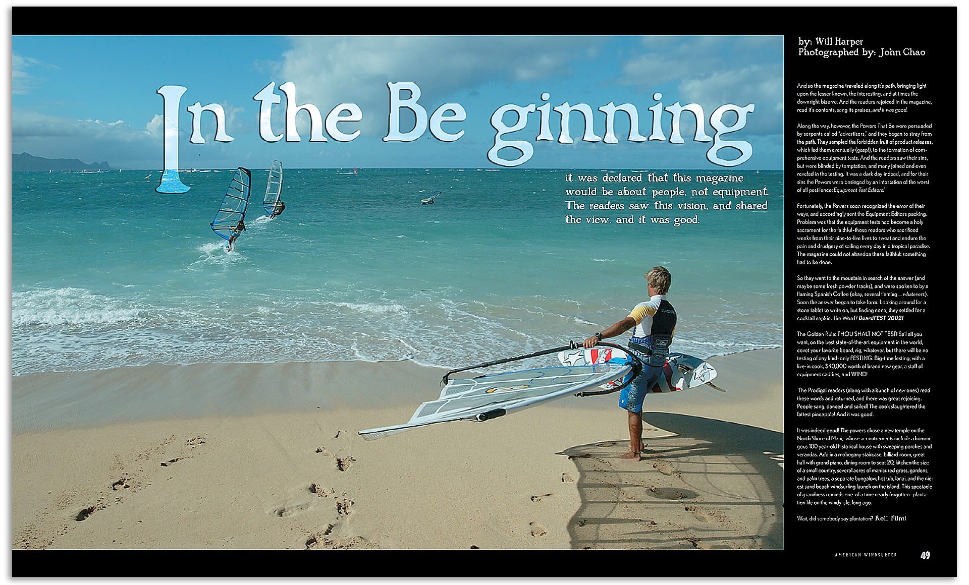 I received your Volume 8, Issue 5 of American Windsurfer free in the mail. I struggled through the bad layout (if you add captions, why not make them readable?), misspellings (hey, buy a spell checker or use the one you already have), and articles that can best be described as marginal (although the women-oriented issue was a great idea, the article on “Surfsitters,” for example, was nothing but fluff and blatant “cheesecake”… or in windsurfing magazines maybe that should be “breeze cake”).