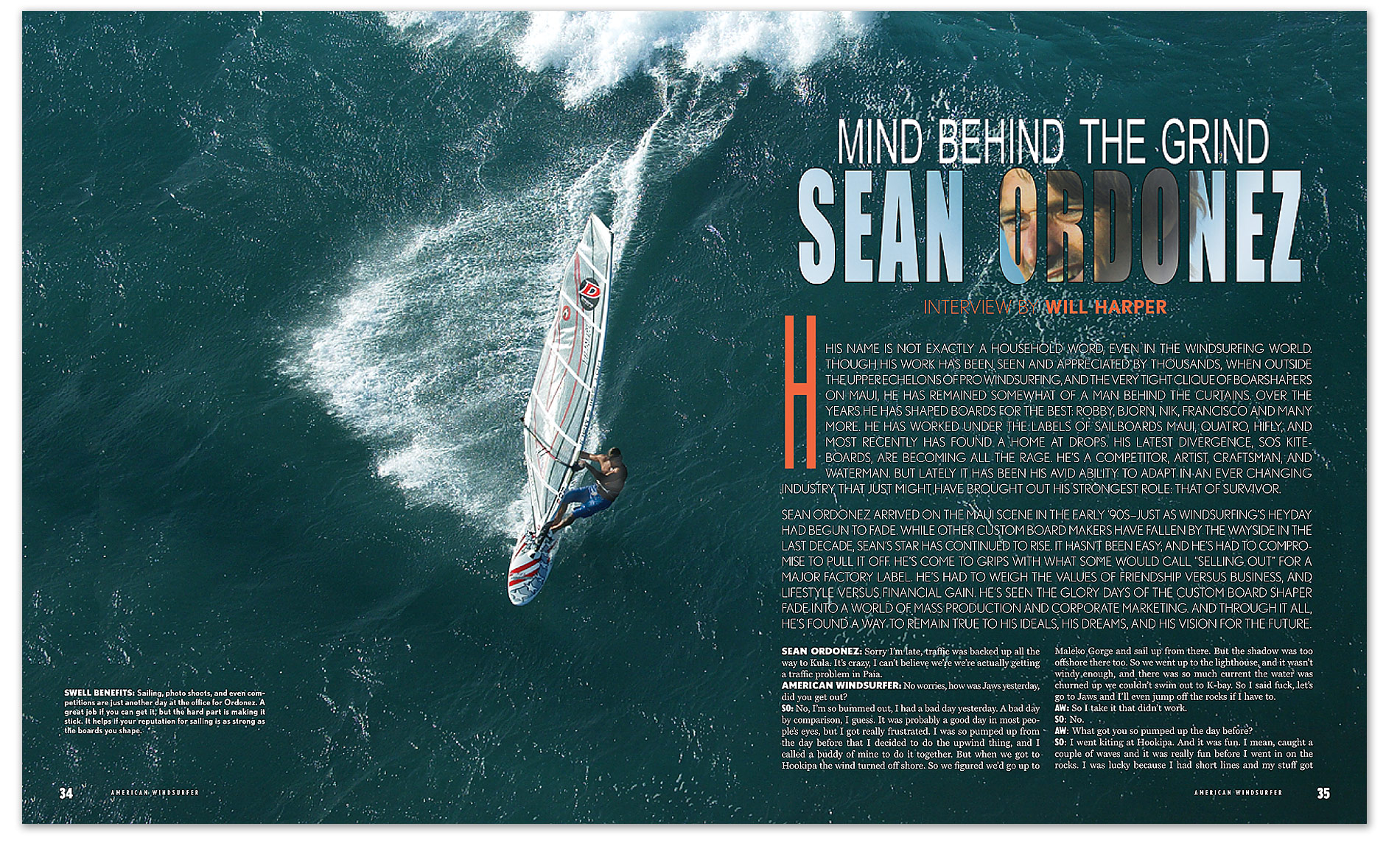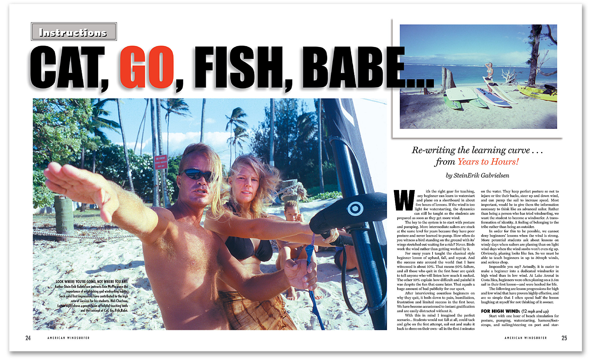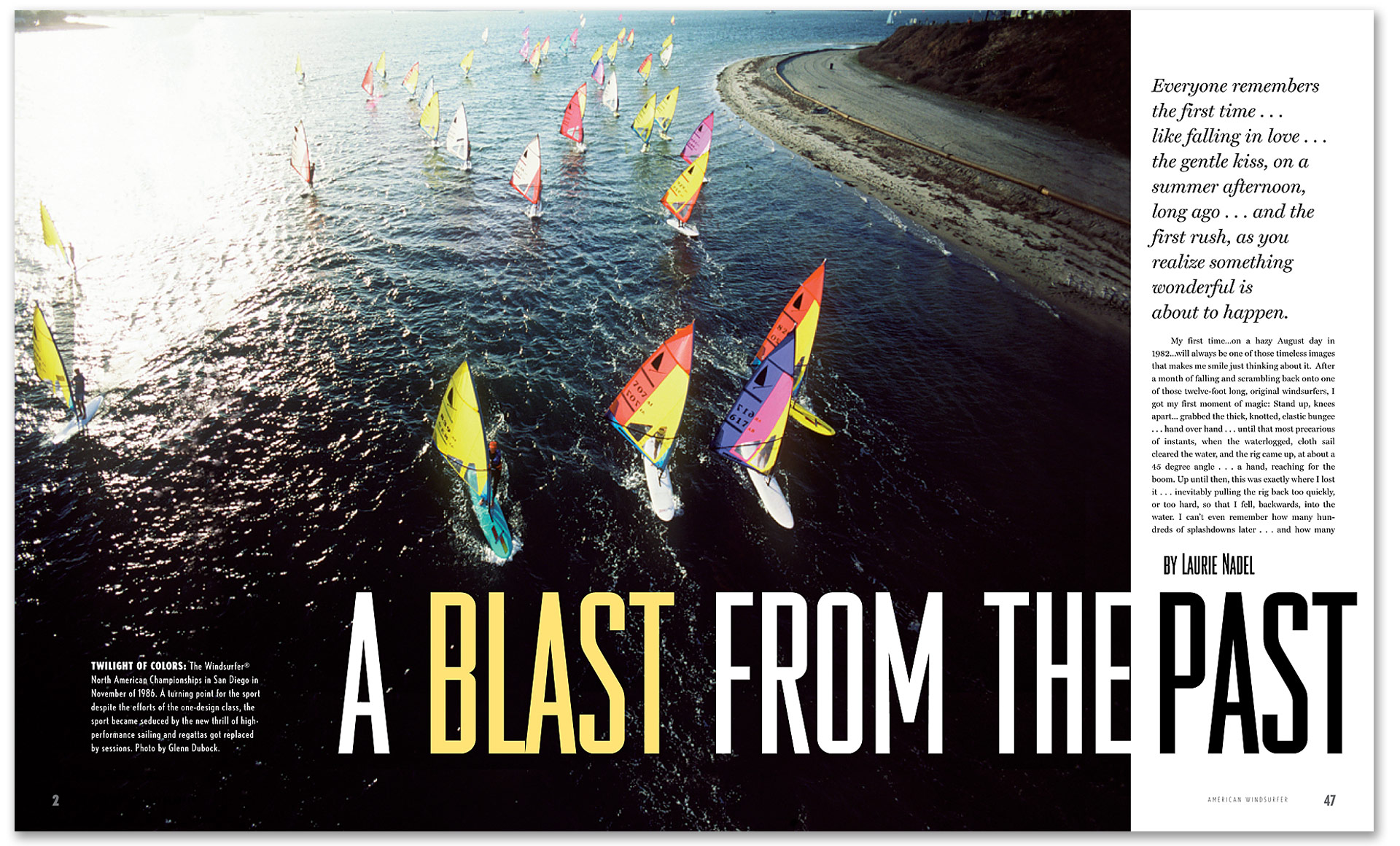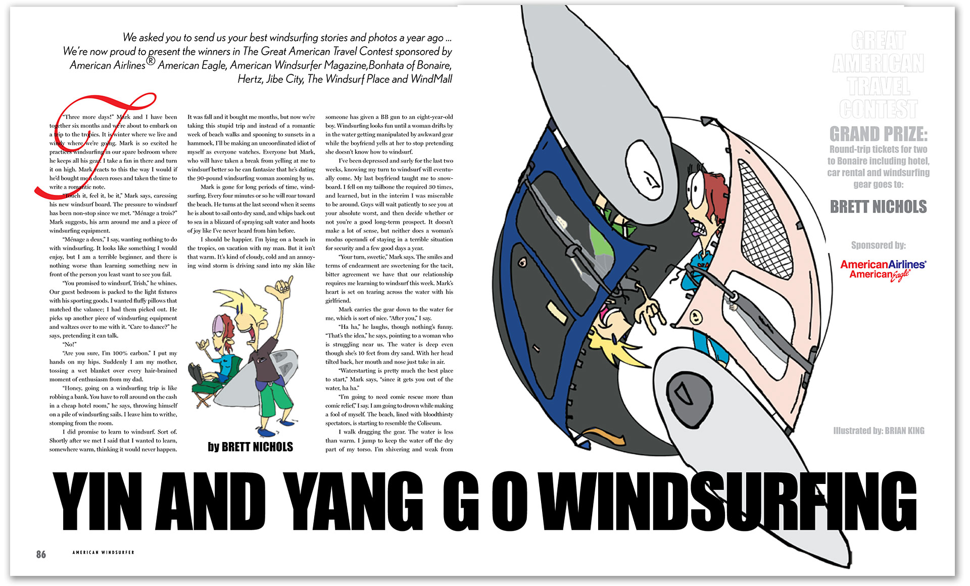 I received your Volume 8, Issue 5 of American Windsurfer free in the mail. I struggled through the bad layout (if you add captions, why not make them readable?), misspellings (hey, buy a spell checker or use the one you already have), and articles that can best be described as marginal (although the women-oriented issue was a great idea, the article on “Surfsitters,” for example, was nothing but fluff and blatant “cheesecake”… or in windsurfing magazines maybe that should be “breeze cake”).
