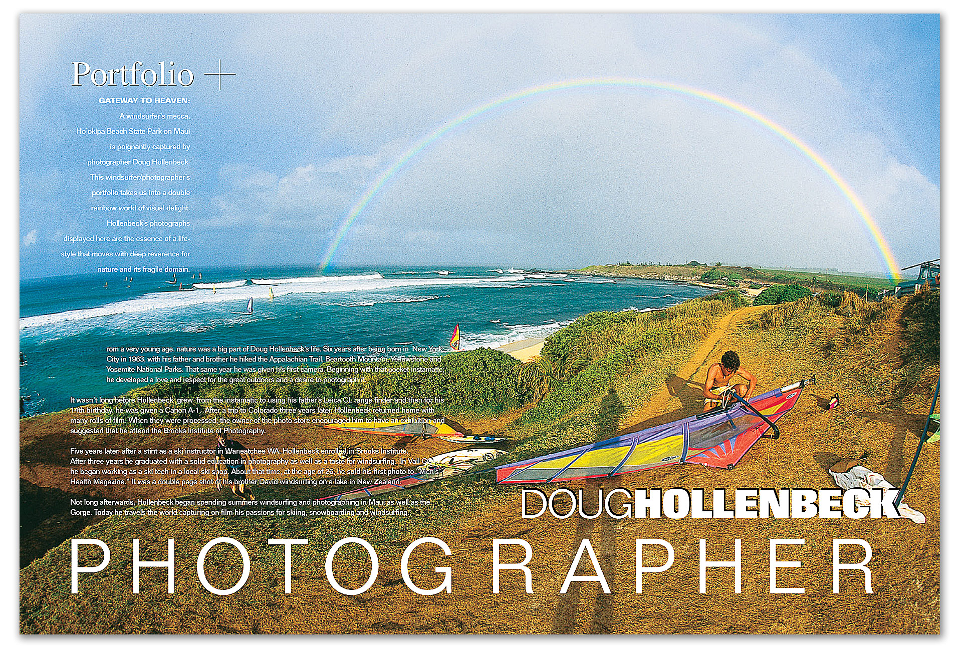 GATEWAY TO HEAVEN: A windsurfer’s mecca, Ho’okipa Beach State Park on Maui is poignantly captured by photographer Doug Hollenbeck. This windsurfer/photographer’s portfolio takes us into a double rainbow world of visual delight. Hollenbeck’s photographs displayed here are the essence of a lifestyle that moves with deep reverence for nature and its fragile domain.