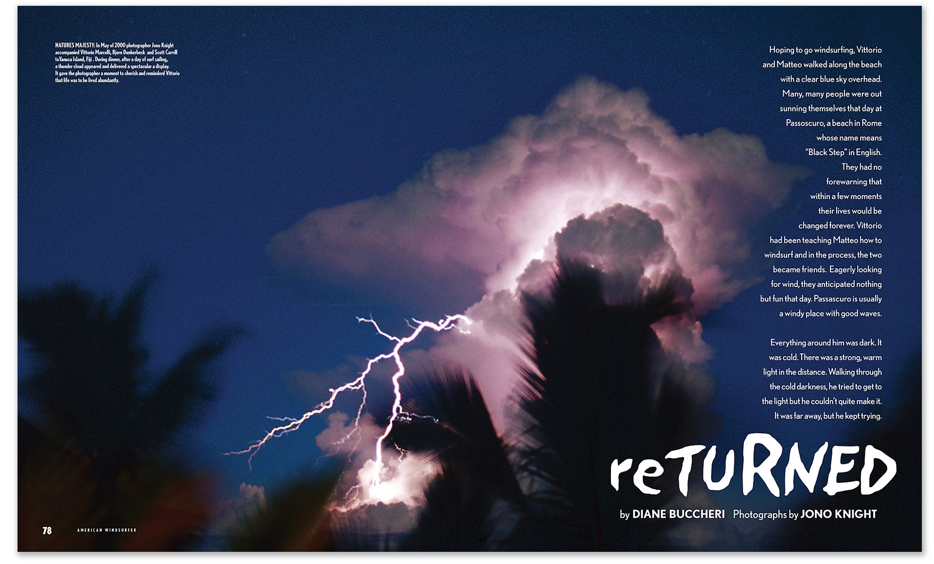 He couldn’t return to the restaurant he owned on the Roman beach. He had other things to do and new values. Without hesitation, Vittorio Marcelli sold his restaurant. He was born again, almost. Before the lightning hit him he wanted things money could buy—expensive fast cars, a big house, a boat. Plans for the future motivated him towards prosperity. More than anything, the future held importance. Long hours of work filled his day and only when there was extra time, he windsurfed. After escaping death and losing a friend with nothing but his future ahead of him, Vittorio threw it all to the wind.