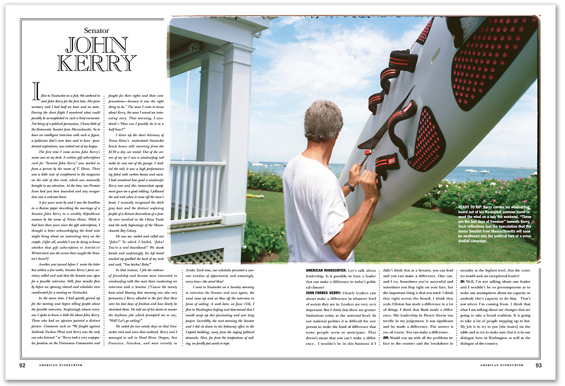 Senator John Kerry and publisher/editor John Chaowindsurfed from Cape Cod to Nantucket on July 3rd, 1998.The six and a half hour crossing celebrated the closing of this article which began on July 4th, 1997.