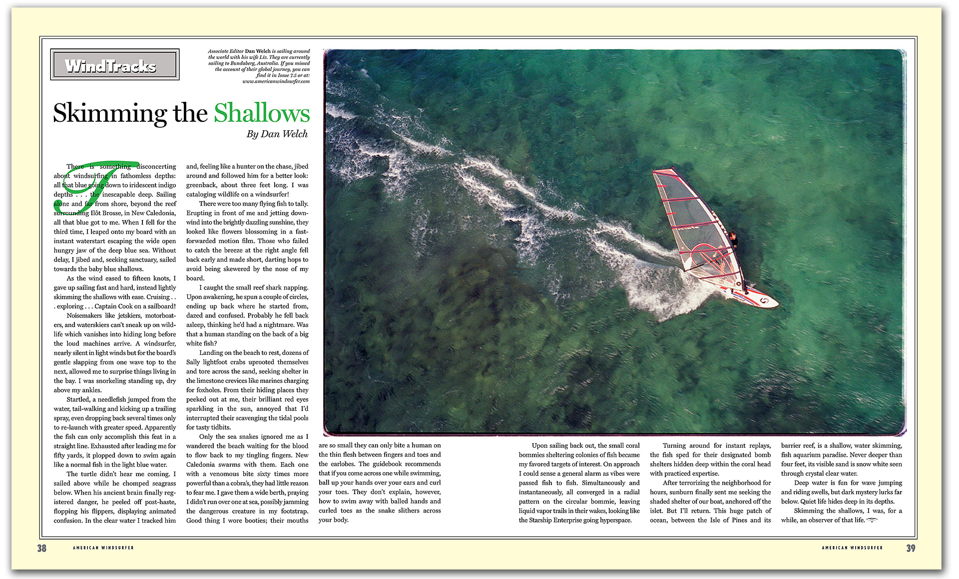 THERE IS SOMETHING DISCONCERTING about windsurfing in fathomless depths: all that blue going down to iridescent indigo depths . . . the inescapable deep. Sailing alone and far from shore, beyond the reef surrounding Ilôt Brosse, in New Caledonia, all that blue got to me. When I fell for the third time, I leaped onto my board with an instant waterstart escaping the wide open hungry jaw of the deep blue sea. Without delay, I jibed and, seeking sanctuary, sailed towards the baby blue shallows.