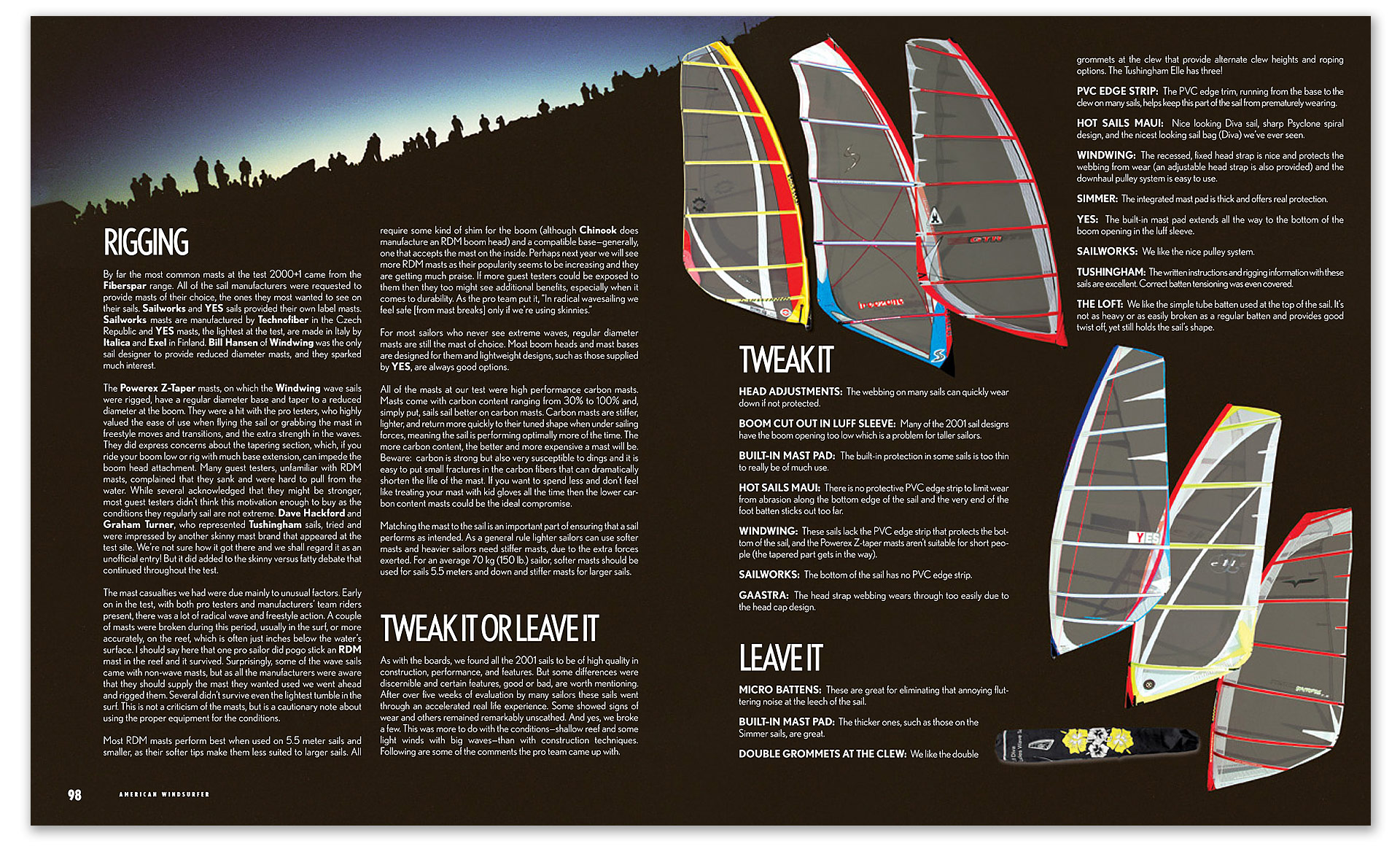 LIKE THE BOARDS, all the 2001 sails underwent a pre-test evaluation. Each sail was weighed when it arrived at the test center (before it got wet) and the specifications of each mast were noted. All sails came supplied with the manufacturer’s chosen mast: make, model, and length. Masts themselves proved to be a great topic for discussion with both the pro testers and the guest testers (see Masts). Before we delve into the test results let’s address some other accessories that were essential to the 2000+1 test.
