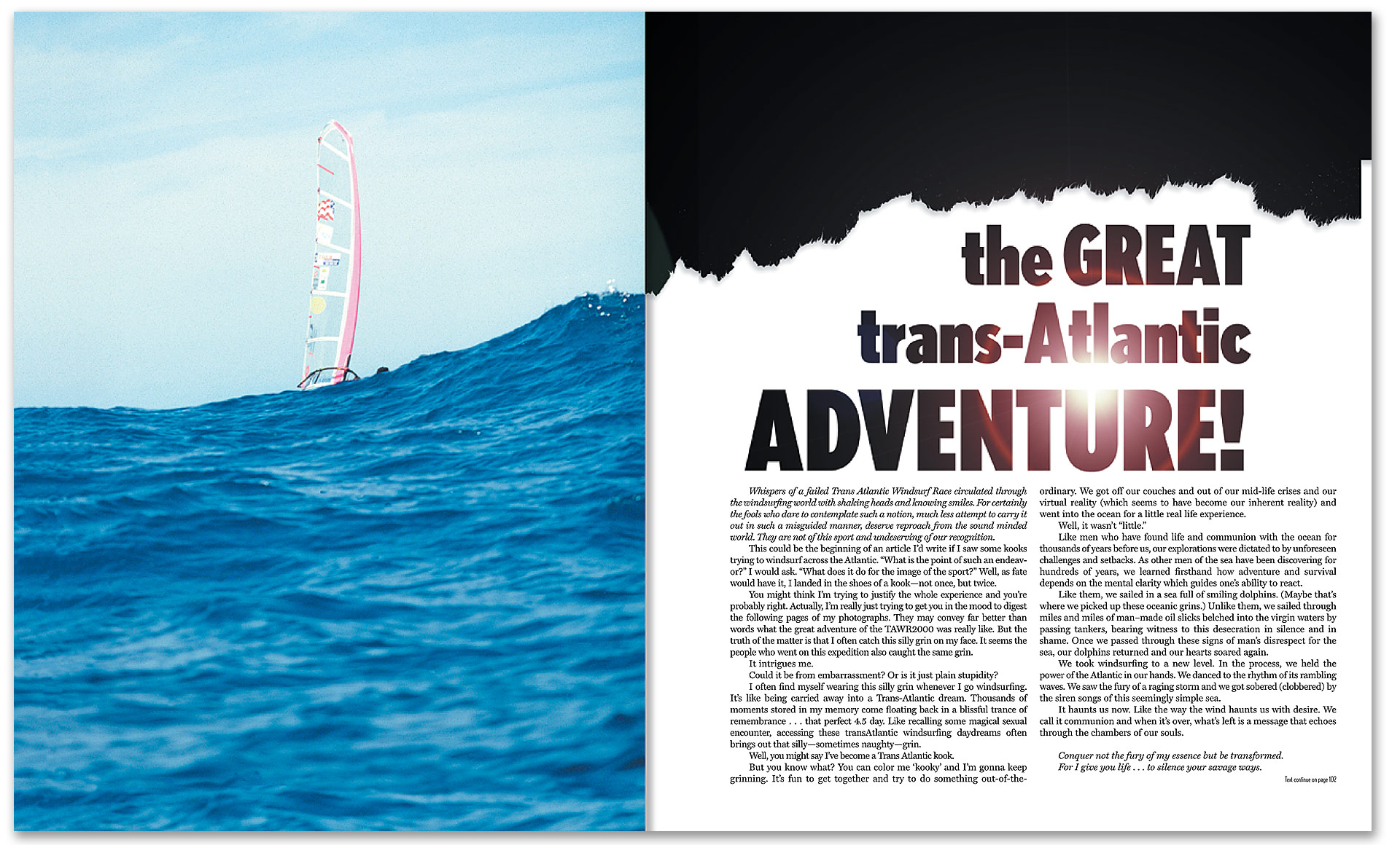 For those of us who have ventured on the Trans-Atlantic Windsurf Race, we have seen the glory of a sunrise and the afterglow of a sunset. We have watched the movement of a day without the clutter of a ragged edge. We were blessed by schools of swimming angels whose sprightly contact filled our inner souls with hope.